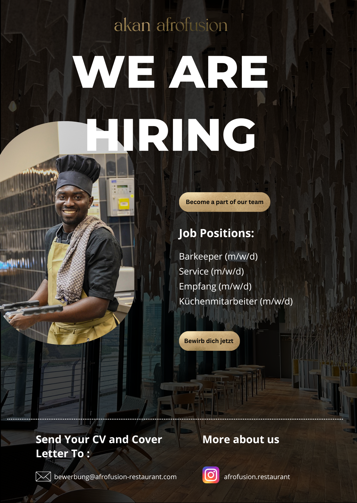 Schicke uns einfach ein kurzes Anschreiben und deinen Lebenslauf an: bewerbung@afrofusion-restaurant.com